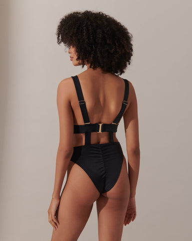 Whether lounging by the pool or heading out to the bar, the classic black Lucerne plunge bikini top is perfect for transitioning day-to-night styles. The daring plunge v-neck creates a flattering silhouette while ensuring optimal support with thick, adjustable straps and a back fastening. Pair with the Lucerne high-waist bikini bottoms to create the full look.